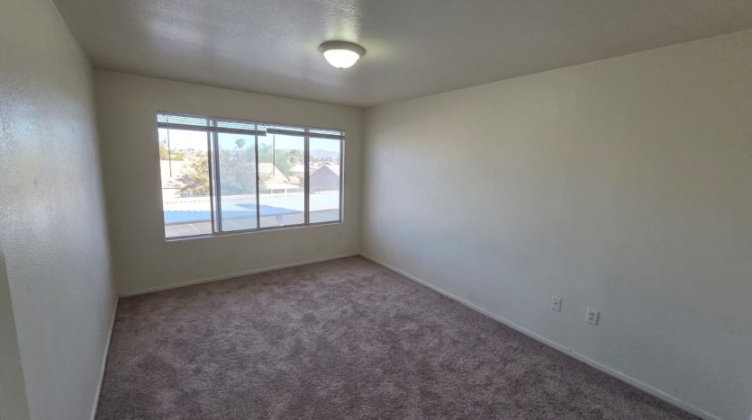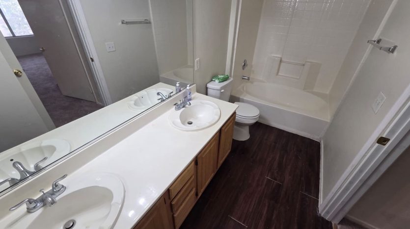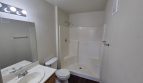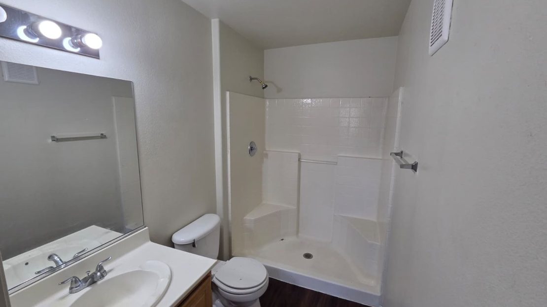 Each of the three bedrooms is generously sized with large windows that let in abundant natural light. The primary suite features a walk-in closet and a private bathroom with a dual-sink vanity and tub/shower combo. A second full bathroom includes a step-in shower with built-in seating, adding both comfort and practicality.